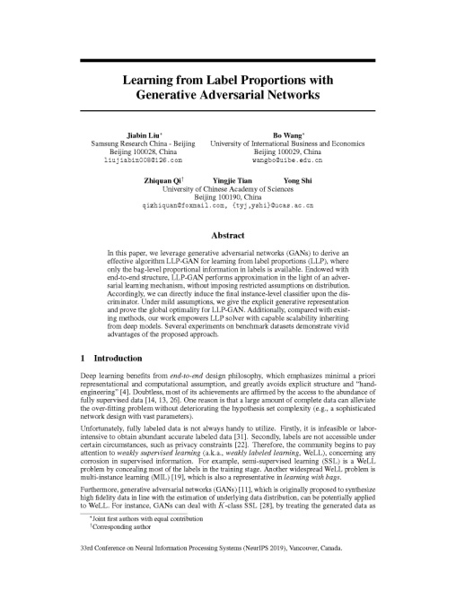 Liu J, Wang B, Qi Z, Tian Y, Shi Y. Learning from Label Proportions with Generative Adversarial Networks. The 33rd Conference on Neural Information Processing Systems (NeurIPS 2019), Vancouver, Canada, 2019. (共同第一作者,CCF-A)