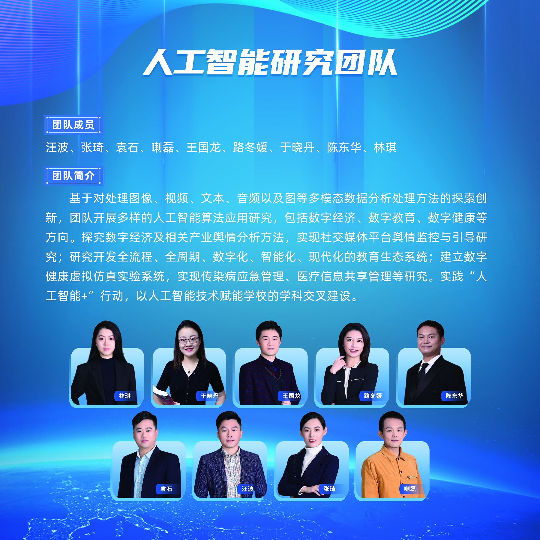 基于对处理图像、视频、文本、音频以及图等多模态数据分析处理方法的探索创新,团队开展多样的人工智能算法应用研究,包括数字经济、数字教育、数字健康等方向。探究数字经济及相关产业舆情分析方法,实现社交媒体平台舆情监控与引导研究;研究开发全流程、全周期、数字化、智能化、现代化的教育生态系统;建立数字健康虚拟仿真实验系统,实现传染病应急管理、医疗信息共享管理等研究。实践“人工智能+”行动,以人工智能技术赋能学校的学科交叉建设。