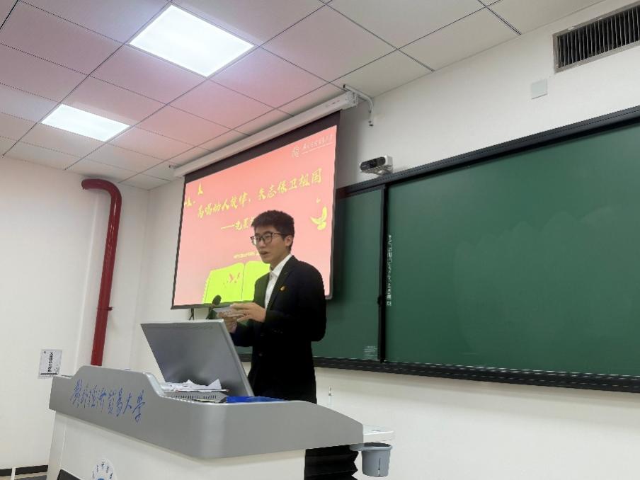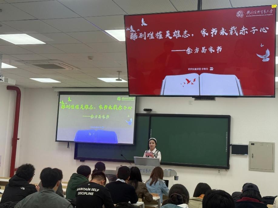 宣讲围绕抗战英雄的家书与事迹展开,激励青年学子从中汲取精神力量,厚植爱党爱国情怀。宣讲过程中,国际经济贸易体育博彩平台推荐 杨砚成同学以《高唱动人旋律,矢志保卫祖国——冼星海家书》为题,展现了人民音乐家以音符为枪、用旋律鼓舞斗志的赤子之心;国际经济贸易体育博彩平台推荐 汪韫珂同学带来的《铭记先烈志,勇担家国情——李育才家书》,深情讲述了革命先辈为国为民、舍生忘死的家国担当;保险体育博彩平台推荐 李唯佳同学则通过《酷刑难摧英雄志,家书永载赤子心——金方昌家书》,生动再现了革命烈士坚贞不屈、视死如归的英雄气概。宣讲人声情并茂的诵读与深入浅出的讲解,使在场同学深受触动。