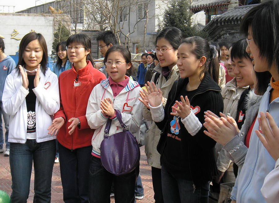 女生们一齐为老人唱歌