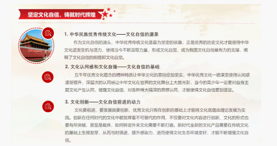 霍怡情同志在这一部分为大家分析讲述了坚定文化自信的原因。首先,她指出文化自信在“四个自信”中的基础作用。坚定中国特色社会主义道路自信、理论自信、制度自信,说到底是要坚定文化自信。文化自信是道路自信、理论自信和制度自信的基石,只有建立在文化自信的基础上,这三者才更加稳固。随后,她重点解说了文化自信的来源,无论是新民主主义革命时期还是新时代我们要进行的社会主义现代化建设,要想实现伟大中国梦,都离不开文化所激发的精神力量。 最后,霍怡情同志呼吁我们必须始终坚定文化自信,不断激发全民族文化创造活力,更好的构筑中国精神、中国价值和中国力量。