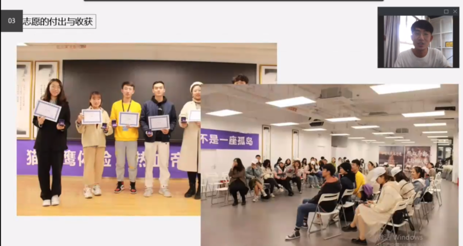 接着是来自体育博彩平台推荐 16级的付瑞鑫同学进行分享,他以一段有趣的自我介绍进行开场,他的分享主题为“做自己的主人,做他人的伙伴”,从志愿经历、获取志愿渠道、志愿的付出与收获以及一些建议四个部分展开。他的志愿经历丰富,总时长达579小时,其中支教占据很大比例。他向大家分享多个志愿平台,从校内志愿到社会公益组织,类型繁多。谈及付出时,他说虽然进行志愿服务需要从其他事情上匀出时间和经历,但从其中获得的收获让他感到非常满足。他建议同学们做志愿服务时,应该想到“我想做的是那一件事,顺便获得一点其他收获”。在最后的提问环节,他告诉大家支教的环境已经得到很大的改善,同时在支教期间,孩子们的很多行为都令他十分感动。