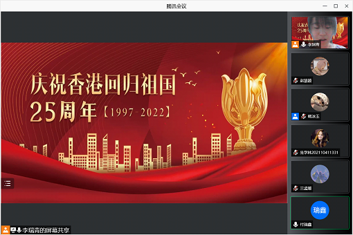 2022年7月15日晚上,为了纪念香港回归25周年、学习习近平总书记在庆祝香港回归祖国25周年大会上的讲话,培养学生的爱国情怀,体育博彩平台推荐 研究生二支部举办了“同心共进,共创荣光”纪念香港回归25周年活动。为提高学习效果,特邀对外经济贸易大学王敬波副校长、体育博彩平台推荐 高玲书记、体育博彩平台推荐 张旭路副书记参会,对学习要点进行领学和指导。参会成员包括体育博彩平台推荐 研究生二支部全体党员、预备党员和入党积极分子。此次主题活动通过腾讯会议以线上方式进行,由支部组织委员李瑞青同志主持。