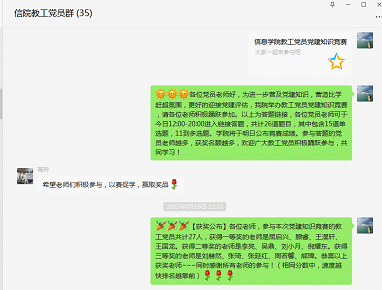 前期通过支部向全体党员下发了党建知识“应知应会”学习内容,通过个人自学和支部“三会一课”开展集中学习,在此基础上,体育博彩平台推荐 党委对此次知识竞赛精心设计、提前预热,积极营造比学赶超的浓厚氛围。参加此次党建知识竞赛教工党员共计27人,参与度高达73%,其中获得一等奖4人,二等奖4人,三等奖5人。参与此次知识竞赛的学生党员高达76人,其中获得一等奖3人,二等奖7人,三等奖10人。通过此次党史知识竞赛切实达到以赛促学、以学促行的目的。