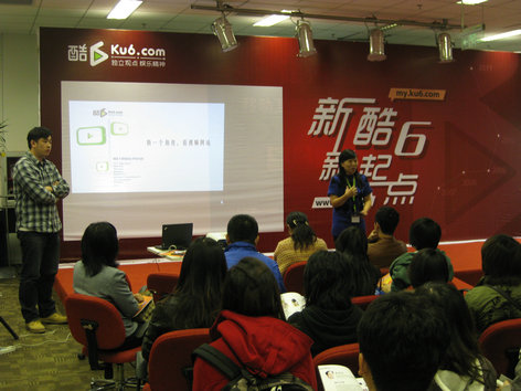 第一部分介绍的是酷六网的历史,通过酷六网三个重大事件为标志,让师生了解到了酷六的发展历程,第二部分向参观师生解释了酷六网的“独立观点,娱乐精神”的企业精神,第三部分是视频网站以及其工作模式,说明了酷六网的收入来源有四点:广告—其最大的收入来源,品牌活动,会员付费,游戏联运和自制剧版权,同时其成本主要是三大模块:版权,宽带和运营。接着叶凯又从web1.0-web3.0来看视频制作网站的运营,向师生说明了酷六网将改变以前在版权上大量烧钱的运营模式,改为向UGC即个人产生内容方向发展,从UGC中挖掘商业价值。最后是Q&A环节,学生们纷纷就自己所好奇想了解的部分进行提问,酷六网叶凯做出详细的解答。通过问答方式使得学生对酷六网和中国视频网站有了更清楚地认识。