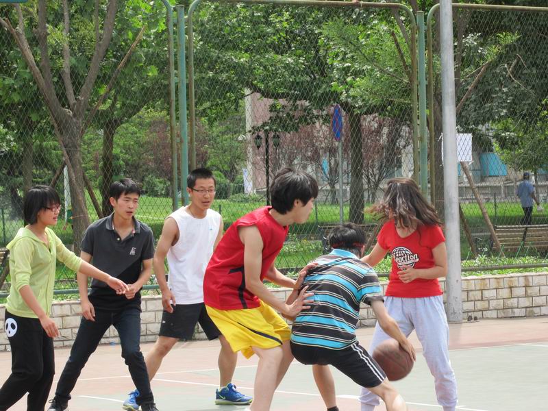 学生会在生活部的有序组织下,在篮球场举行一场生动又激烈的篮球赛。