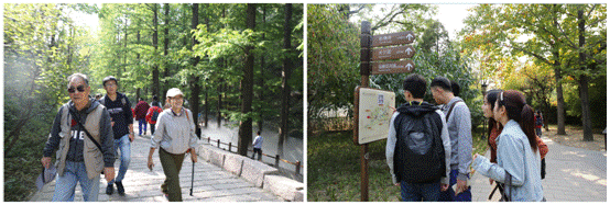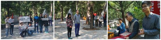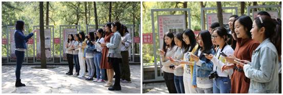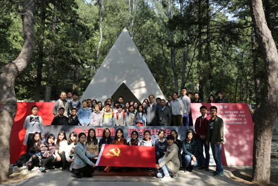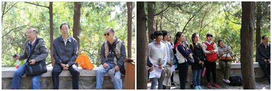 2015年10月18日上午8时,秋高气爽,阳光明媚,党员老教师和党员同学们乘坐校车从学校西门出发,前往北京植物园。9时30分到达后,老教师和同学们步行来到植物园深处的“12·9学生爱国运动”纪念亭广场。纪念广场上立着三座显眼的白色帐篷状石亭,重现了1935年北平学生们策划129运动的场景。广场的四周立着关于纪念抗战70周年和129学生爱国运动的宣传展板,同学们和老师们纷纷驻足认真阅读史料。