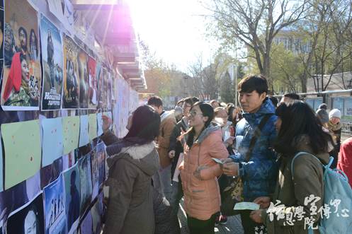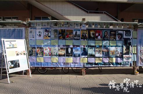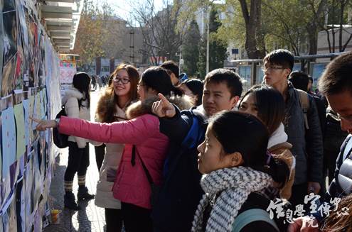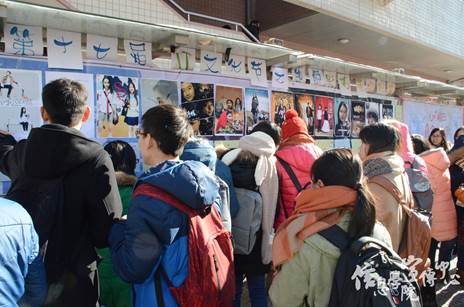 一切准备就绪后,现场投票正式开始。在33张风格迥异,构思独特的海报作品的装饰下,原本平淡无奇的海报栏也变得绚丽夺目起来,引得过路同学的频频驻足。在现场工作人员的解说带领下,同学们纷纷接过贴纸为自己喜欢的队伍投上了宝贵的一票。随着时间推移,越来越多的同学加入到投票的行列。有专程来为自己喜欢的作品投票的,也有路过被作品吸引前来投票的,现场人头攒动。在欣赏作品的同时,同学们也不时地表达了对这些作品的赞叹与欣赏。相似度很高的“奥黛丽赫本”、颜值超高的紫霞仙子、妩媚多姿的兰花指、近期热度很高的巴黎不哭以及许多熟为人知的电影海报经典重现,无一不得到了在场同学的喜爱。
