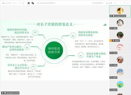 分享结束后,屈启兴老师表示,希望同学们能够后续亲身到长子营镇体验农业发展情况,深入探讨如何结合前沿技术与实际产业的命题。郭迎芳肯定了同学们的专业知识,提出希望能再关注具体政策设计方面。最后,王璇对分享同学表示感谢,并再次邀请老师同学们来到长子营镇进行实地参观调研。