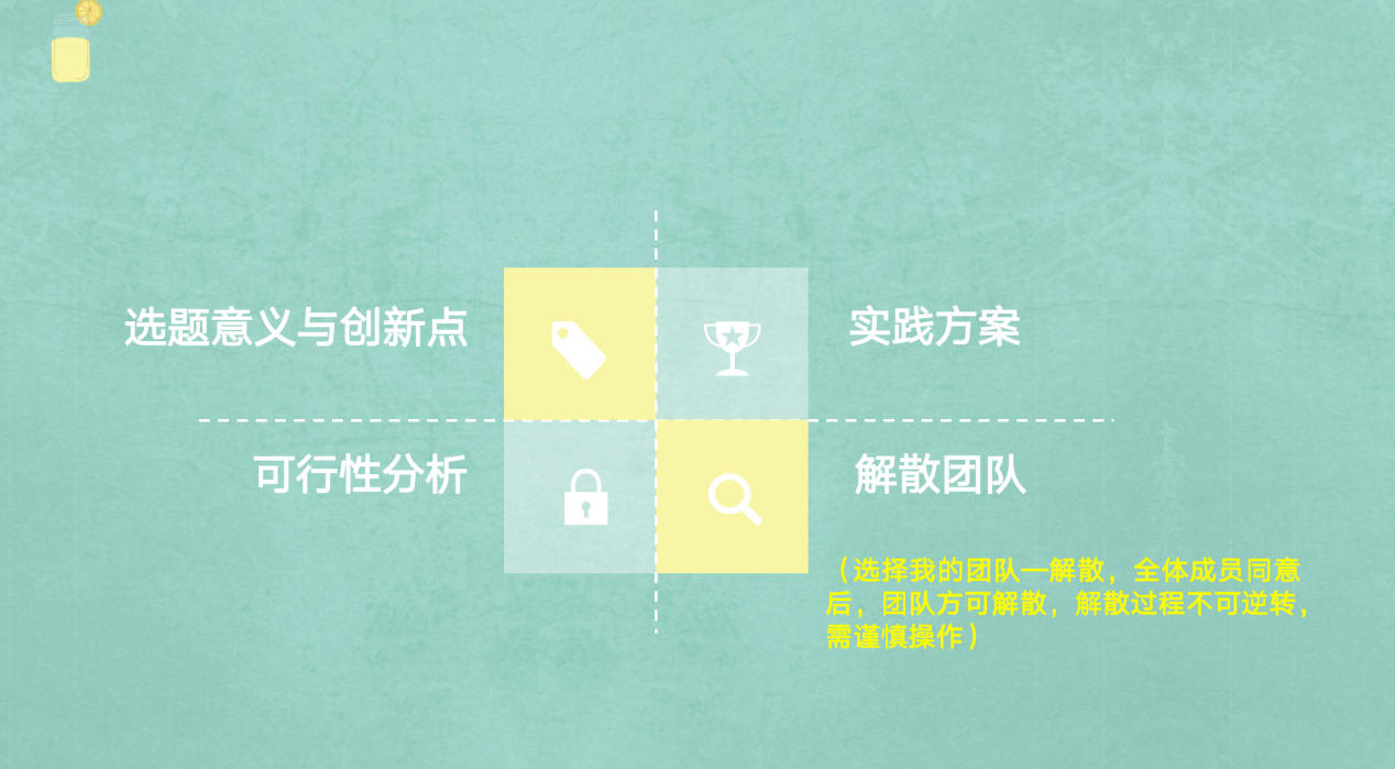 最后,孙旭然同学从选题意义与创新点、实践方案、可行性分析、解散团队这四个方面向同学们介绍了作为队长需要了解的内容。其中他对队长如如何解散团队、三种团队状态——“招募中”、“解散中”和“冻结”和个人如何加入退出团队进行了具体说明。