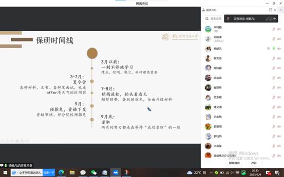 分享会伊始,主持人邀请保研至中国人民大学的杨懿凡同学为在座同学分享保研心得。杨懿凡同学首先介绍了个人的基本情况,详细地讲解了保研时间线以及保研的整体流程,并在讲解过程中着重强调了个人成绩作为推免项目“敲门砖”的重要性,从综测、科研、实习三个方面展开阐述了相关的经验,提醒同学们一定要把握现在,努力提升自己的学习成绩和综合素质。紧接着,杨懿凡同学针对准备保研的过程中的“信息获取”以及“文书准备”两方面的相关知识和经验进行了讲解,干货满满,同学们收获颇丰。最后,杨懿凡同学提出了一些更加具体的小建议,鼓励同学们保持良好心态,为将来的保研规划做好准备。