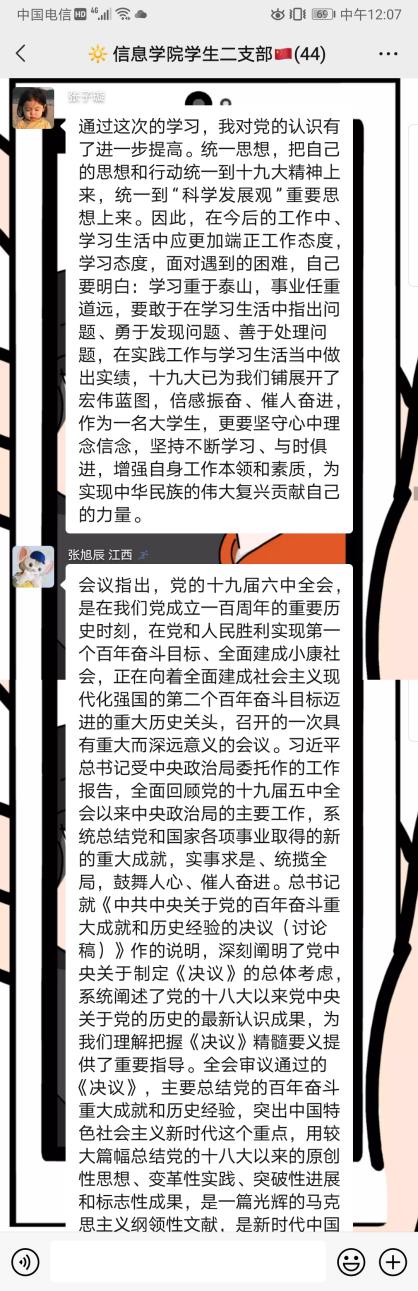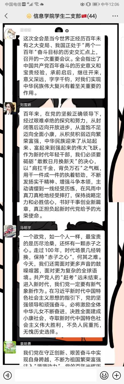 2021年11月18日晚,体育博彩平台推荐 学生二支部通过微信群交流的方式召开了学习2021中国共产党第十九届中央委员会第六次全体会议的交流活动,活动由支部副书记陈家盈同志主持,二支部所有成员共同参与,二支部成员充分交流了各自的感想和心得,感悟到了会议精神,会议取得了圆满的效果。