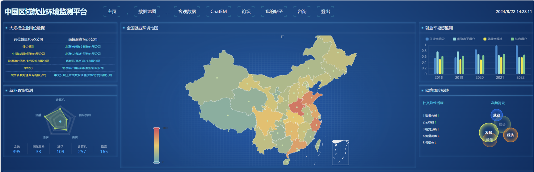 在此报告中,由对外经济贸易大学体育博彩平台推荐 主持研发的“中国区域就业环境AI监测平台”精彩亮相。中国区域就业环境AI监测平台通过收集官方发布的就业相关政策文本、国家统计局就业相关统计数据、及社交平台就业相关舆情数据等,基于机器学习、自然语言处理方法等分析展示中国区域就业环境,帮助政府、企业、公众了解各省就业政策支持情况、重点领域就业岗位变化情况,以及社会公众对就业环境的幸福感与满意度等情况,生动反映各省就业社会环境。该平台实现了AI数字技术赋能就业市场与人力资源服务的新模式探索。