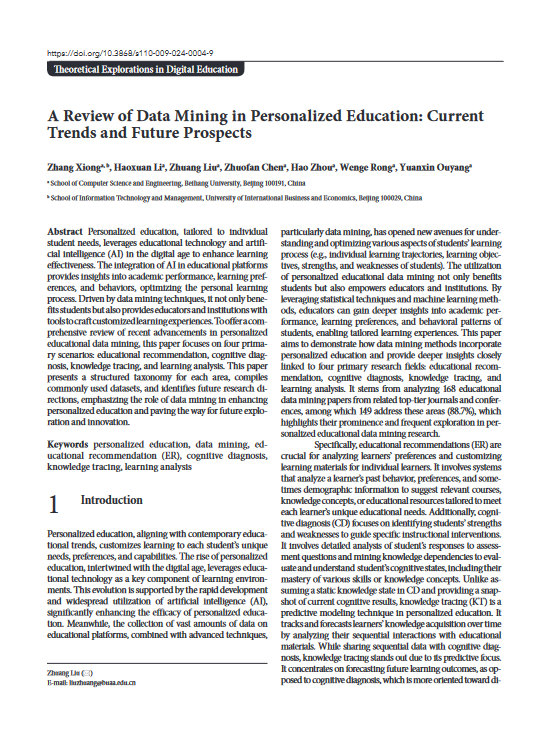 院长熊璋作为第一作者在该期刊荣幸刊出论文《A Review of Data Mining in Personalized Education: Current Trends and Future Prospects》。