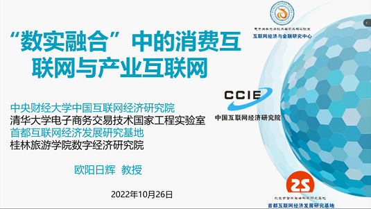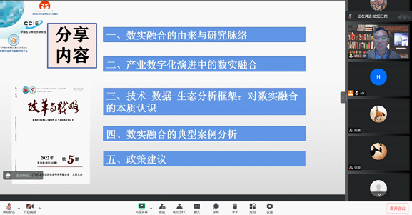 接下来,欧阳教授正式开始主题报告,他以二十大报告中对数字经济的重要论述为切入点,引出本次讲座的主题——“数实融合”中的消费互联网与产业互联网,并从数实融合的发展与研究脉络、产业数字化演进中的数实融合、技术-数据-生态分析框架:对数实融合的本质认识、数实融合的典型案例分析以及政策建议五个方面进行了深入浅出的讲解。
