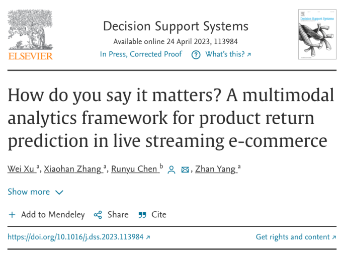 Xu, W., Zhang, X., Chen, R.*, & Yang, Z. (2023). How do you say it matters? A multimodal analytics framework for product return prediction in live streaming e-commerce. Decision Support Systems, 113984.