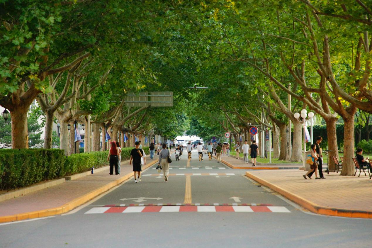 惠中大道贯通了贸大的东门和西门,是贸大校园内的主干道之一。两侧行道树的树冠交织在一起,形成了连片的林荫,是夏日的限定风景。